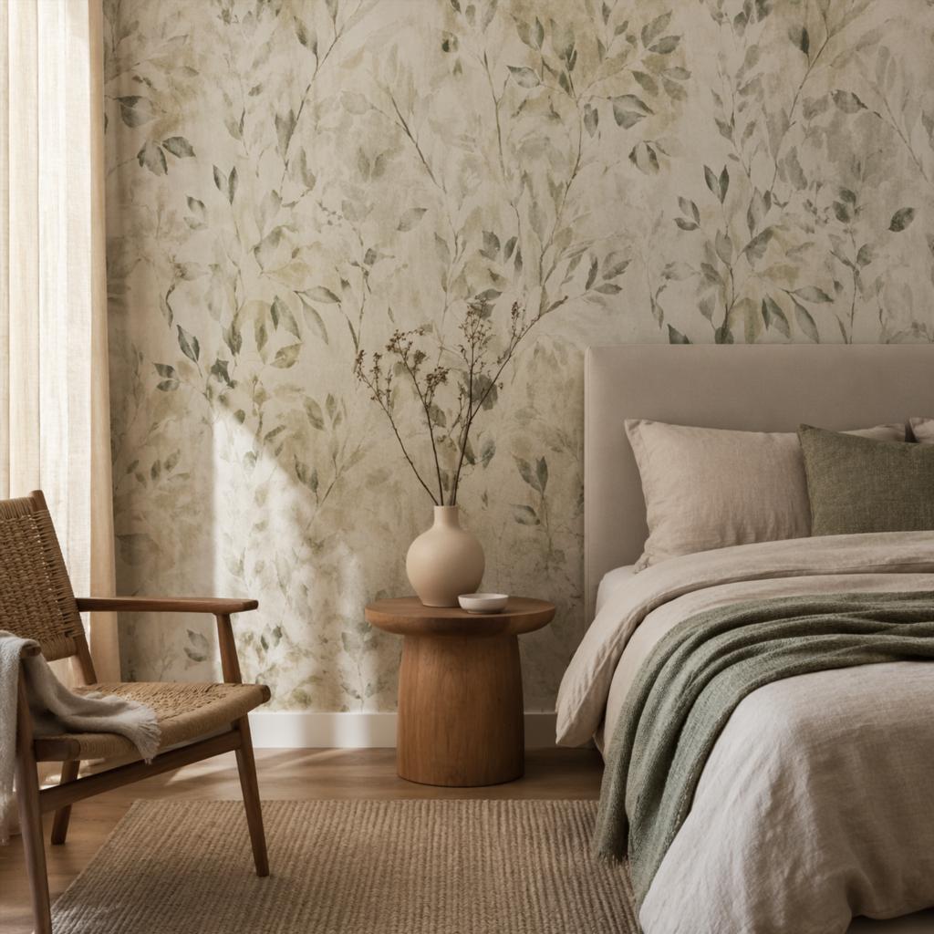 Растительные мотивы снова в центре внимания, но их стиль сильно отличается от того, что было популярно много лет назад. Сейчас это не обязательно мелкий пестрый цветочек по всей стене. В моде крупные листья, акварельные силуэты растений, приглушенные тропические мотивы, ветви, травы, силуэты деревьев и природные композиции в сложной палитре.